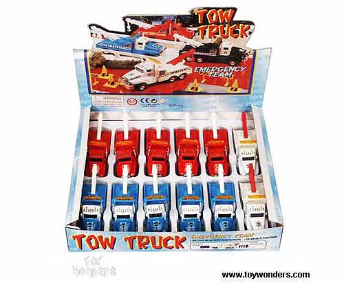9895/8D Emergency Tow Truck. This tow truck is a 5"Lx 1.75"Wx 2.25"H die cast metal pull back wrecker. 12 pcs/display in assorted colors. 72 pcs/inner.