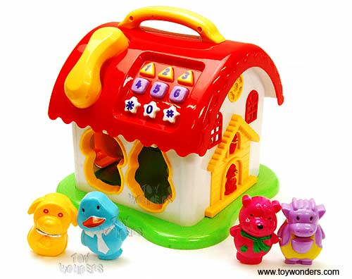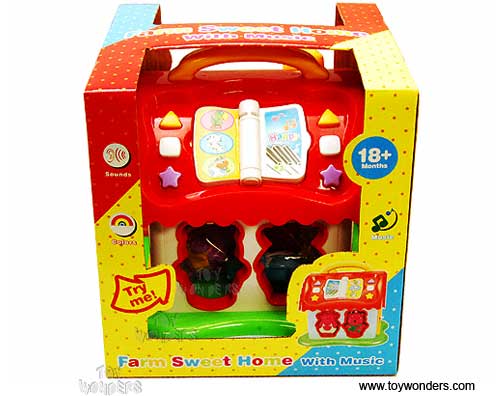 5010A Farm Sweet Home w/ Music. This Farm Sweet Home features flippable page, different buttons with different sounds & melodies, adjustable clock, phone, and removable animal shapes. Requires 2 "AA" batteries (included). Box size: 8.75"L x 8.75"W x 9.25"H. 6 pcs per inner box. For 18 months and up.