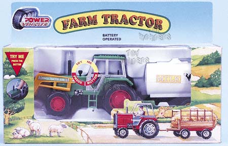 8204F Farm Tractor Set. 5.5" farm tractor with trailer that goes forward and stops. With engine sounds and flashing light. "Try Me" box. Includes 2 "AA" batteries. Box size: 13.5"W x 9"H x3.75"D. 12 pcs/inner.