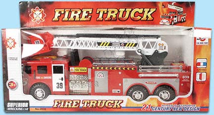 2039 The Fire Truck includes plastic fire engine with extendable ladder, flashing lights, and sounds. Battery operated fire truck with bump-n-go action, flashing lights, and siren. Box size: 20.75"Lx 6"Wx 11.5"H. Note: This item contains no diecast metal.