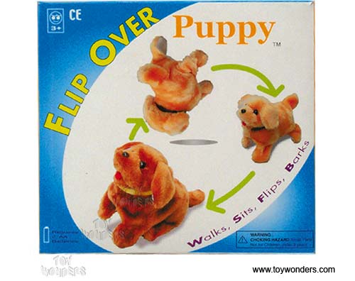 8811B Flip Over Puppy. 7" cute little dog that walks, sits, barks, then amazingly somersaults to land on its feet again!!! Great toy for pets. Three assorted styles. Requires 2 "AA" batteries. Box size: 7"W x 6.5"H x 4"D. 12 pcs/inner.