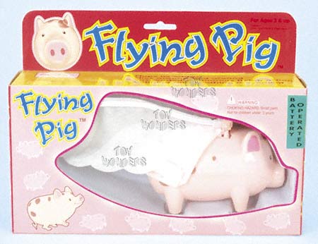 601 Flying Pig. 8.5" battery operated flying pig (17" wingspan). The pig flies around in a circular motion on a string with flapping wings. Requires two "AA" batteries (not included). Box size: 8"Hx 10.5"Wx 3"D.