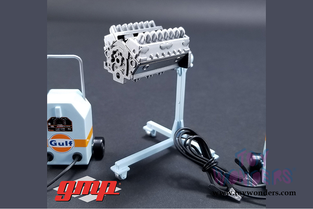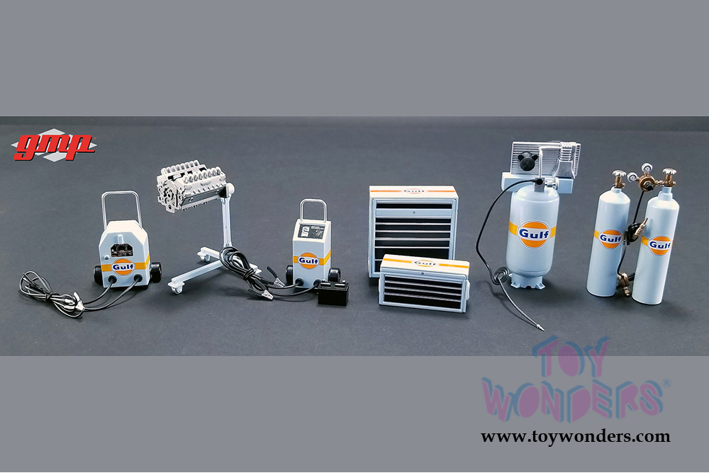 18872 GMP - Gulf Oil Shop Tool Set 1. Scaled for 1:18 scale model cars or 1:18 scale dioramas. This exclusive Shop Tool Multipack includes welder, engine block with stand, air compressor, battery charger with battery, acetylene torch set and stackable toolboxes. Box size: 9"L x 8.5"W x 2"H. Manufactured by Greenlight.