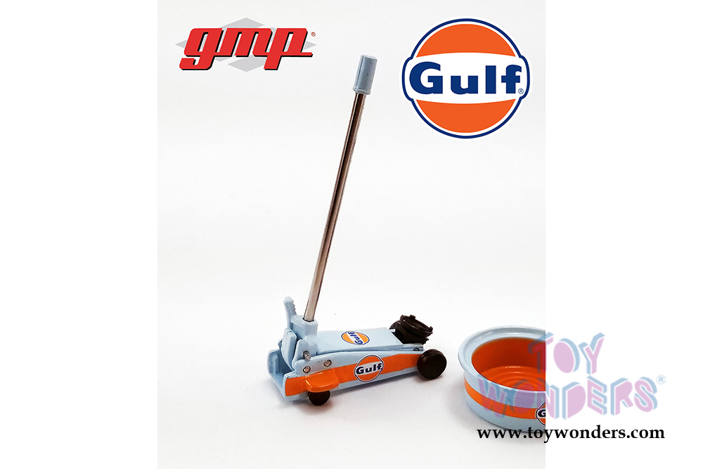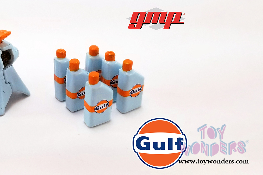 18942 GMP - Gulf Oil Shop Tool Set 2. Scaled for 1:18 scale model cars or 1:18 scale dioramas. This exclusive Shop Tool Multipack includes: Creeper, Floor jack, Oil catch pan, Ramps (2 pieces), Oil bottles (12 pieces) and Jack stands (4 pieces). Box size: 9"L x 8.5"W x 2"H. Manufactured by Greenlight.