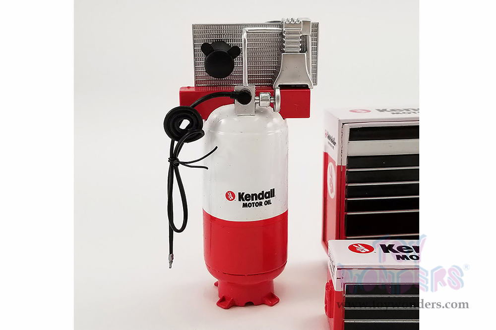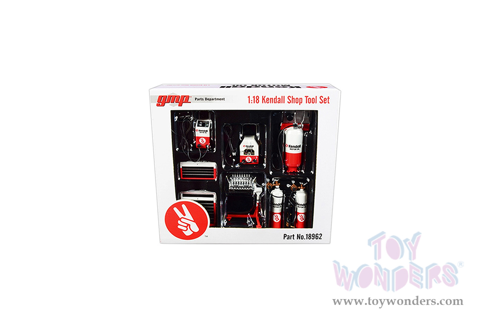 18962 GMP - Kendall Motor Oil Shop Tool Set #1. Scaled for 1:18 scale model cars or 1:18 scale dioramas. This exclusive Shop Tool Multipack includes welder, engine block with stand, air compressor, battery charger, acetylene torch set and toolboxes. Box size: 9"L x 8.5"W x 2"H. Manufactured by Greenlight.