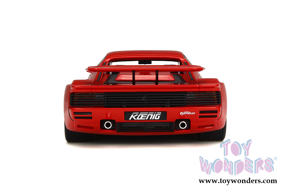 GT124 GT Spirit - 1966 Ferrari Koenig Testarossa Twin-Turbo Rosso corsa Hardtop. 1:18 resin model collectible model car. This is a 10.5"L x 4.5"W x 3.5"H resin car. Real rubber tires, detailed interior and exterior. This Koenig Testarossa Twin-Turbo is manufactured by GT Spirit. Box size is 13"L x 7"W x 5.75"H. Item GT124 is in RED color. Car is not openable.