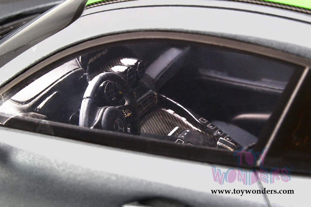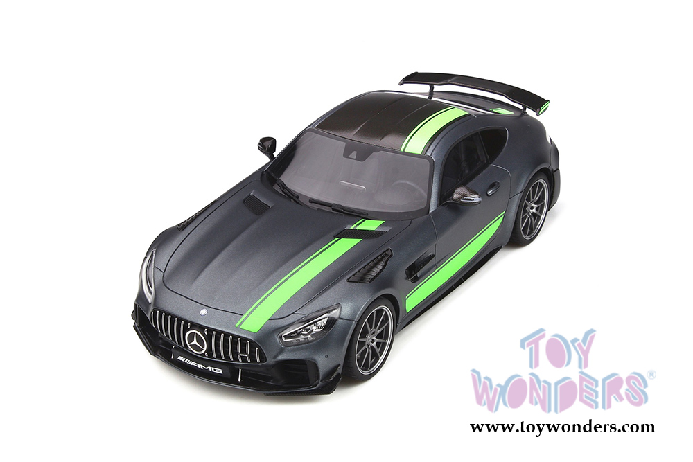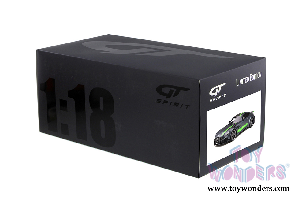 GT265 GT Spirit - 2019 Mercedes Benz AMG GT-R Pro Hardtop. 1:18 resin model collectible model car. This is a 9.5"L x 4.5"W x 2.75"H resin car. Limited edition, real rubber tires, detailed interior and exterior. This Mercedes is manufactured by GT Spirit. Box size is 13.5"L x 7.5"W x 6.5"H. Item GT265 is in Dark GRAY with green stripes. Car is not openable.