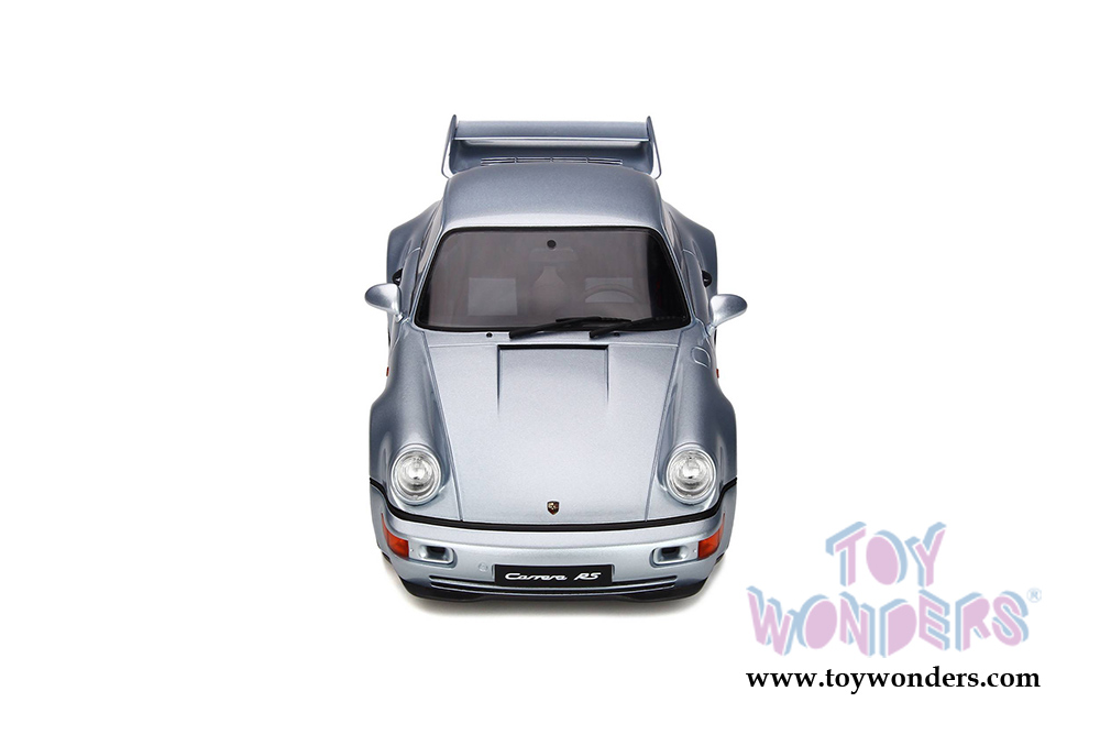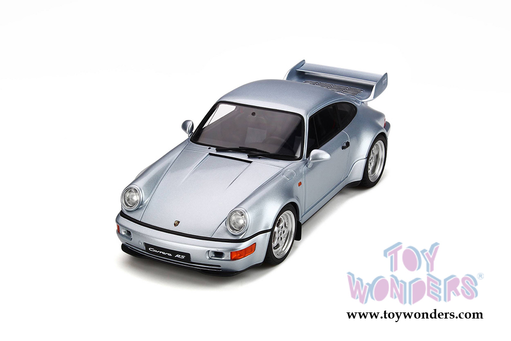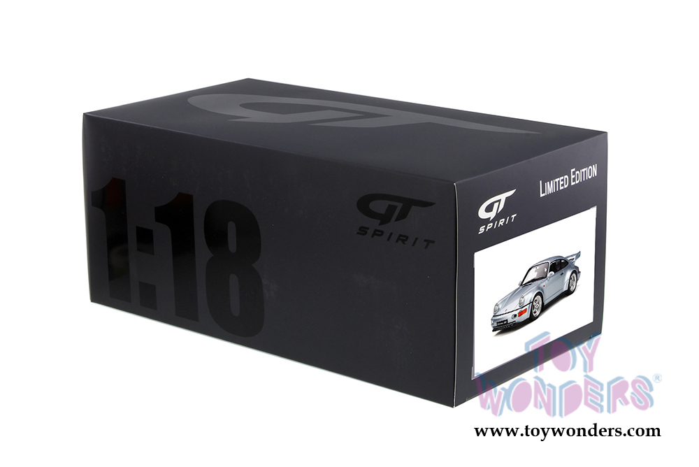 GT735 GT Spirit - 1993 Porsche 911 Carrera RS 3.8 Hardtop. 1:18 resin model collectible model car. This is a 10.5"L x 4.5"W x 3.5"H resin car. Real rubber tires, detailed interior and exterior. This Porsche is manufactured by GT Spirit. Box size is 13.5"L x 7.25"W x 6.5"H. Item GT735 is in Polar SILVER. Limited Edition to 999 pcs. Car is not openable.