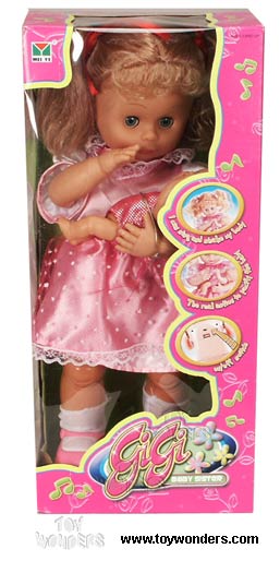 33012 Gigi Baby Sister. 16" battery operated doll features singing and shaking her body to pacify the baby. Her eyes will close when lying down. Requires 3 "AA" batteries (not included). Box size: 7"Lx 6"Wx 15.75"H.