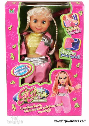 33001 Gigi Rock' N Roll Doll w/ Microphone. 15.75" fashion doll features flashing bracelets, singing, dancing, moving hands & waist. Her eyes can open & shut. Uses 4 "AA" batteries (not included). Box size: 10"Lx 3.75"Wx 15.75"H.