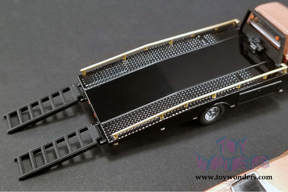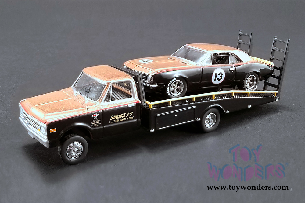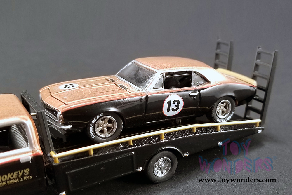 51164 Greenlight/ACME - 1967 Chevrolet® C30 Ramp Truck with 1967 Chevrolet® Camaro® Trans Am #13. 1:64 scale diecast collectible model car. This racing car set comes with a 3" long Camaro® and a 4.5" long truck diecast collection car with authentic decoration and true-to-scale detail. This racing car set is manufactured by Greenlight/Acme. Each set individually blister carded. Card size: 8.5" x 8.5". Item 51164 comes in GOLD color with black.