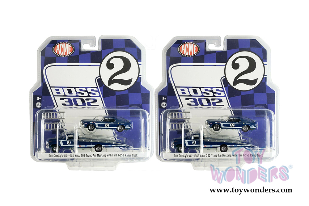 Greenlight/ACME - Dan Gurney's | Ford F-350 #2 Ramp Truck with 1969 Ford Mustang Boss 302 Trans Am #2 (1/64 scale diecast model car, Blue) 51268