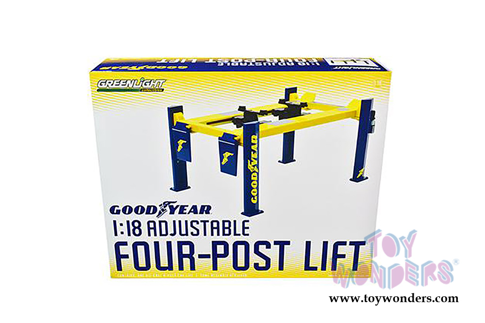 13581 Greenlight - Adjustable Four-Post Lift - Goodyear Tires. This Post Lift is great for decorating 1/18 scale cars and dioramas. Individually packed in a box. Box size: 13.75"L x 3.5"W x 11"H. This Lift is manufactured by Greenlight.