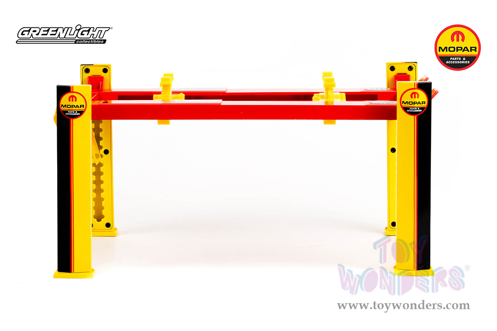 13649 Greenlight - 1:18 Scale Adjustable Four-Post Lift - MOPAR Parts & Accessories. This Post Lift is great for decorating 1/18 scale cars and dioramas. Individually packed in a box. Box size: 13.75"L x 3.5"W x 11"H. This Lift is manufactured by Greenlight.