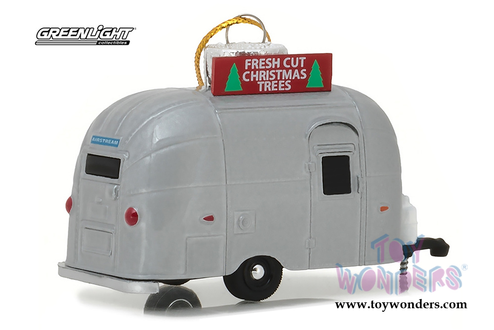29915/48 Greenlight - Airstream 16' Bambi Holiday Ornament with Hook Ring "Fresh Cut Christmas Trees". This trailer/hauler is a 3" Long diecast ornament. Limited Edition. Each trailer individually blister carded. Card size: 7.75" x 5.75". These cars are manufactured by Greenlight. Item 29915/48 comes in SILVER.