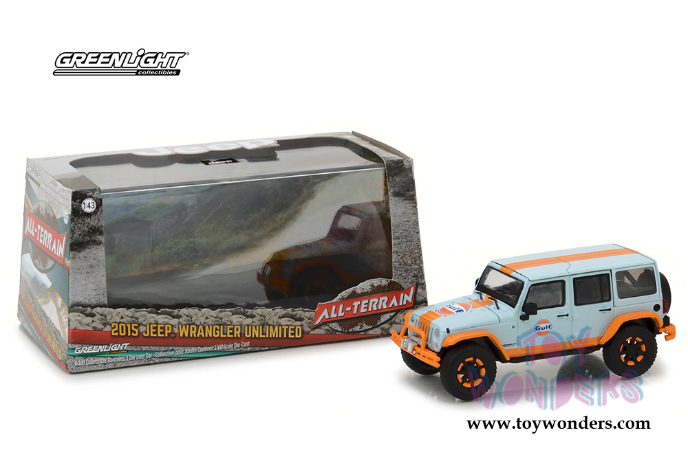 Greenlight - All Terrain Jeep Wrangler Unlimited Gulf Oil with Off-Road Bumpers (2015, 1/43 scale diecast model car, Blue w/Orange) 86089