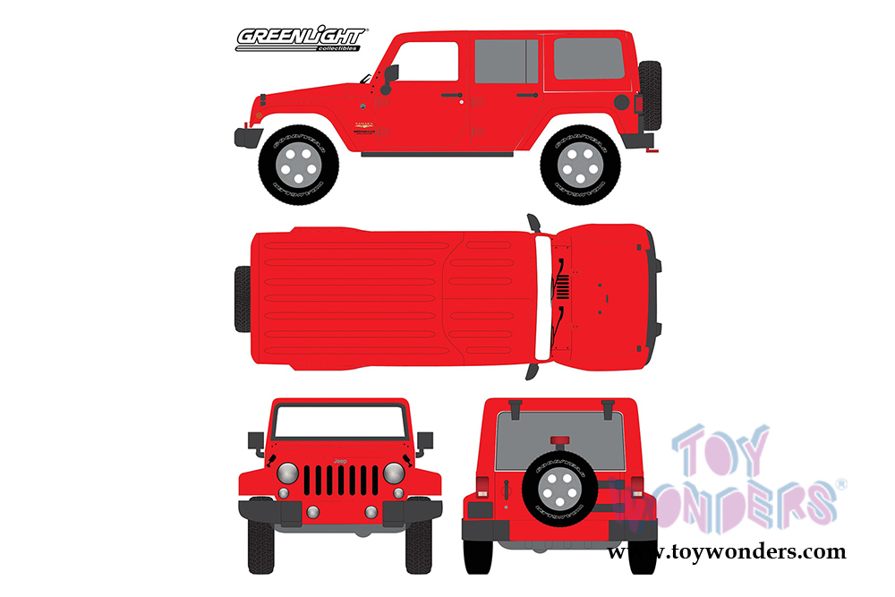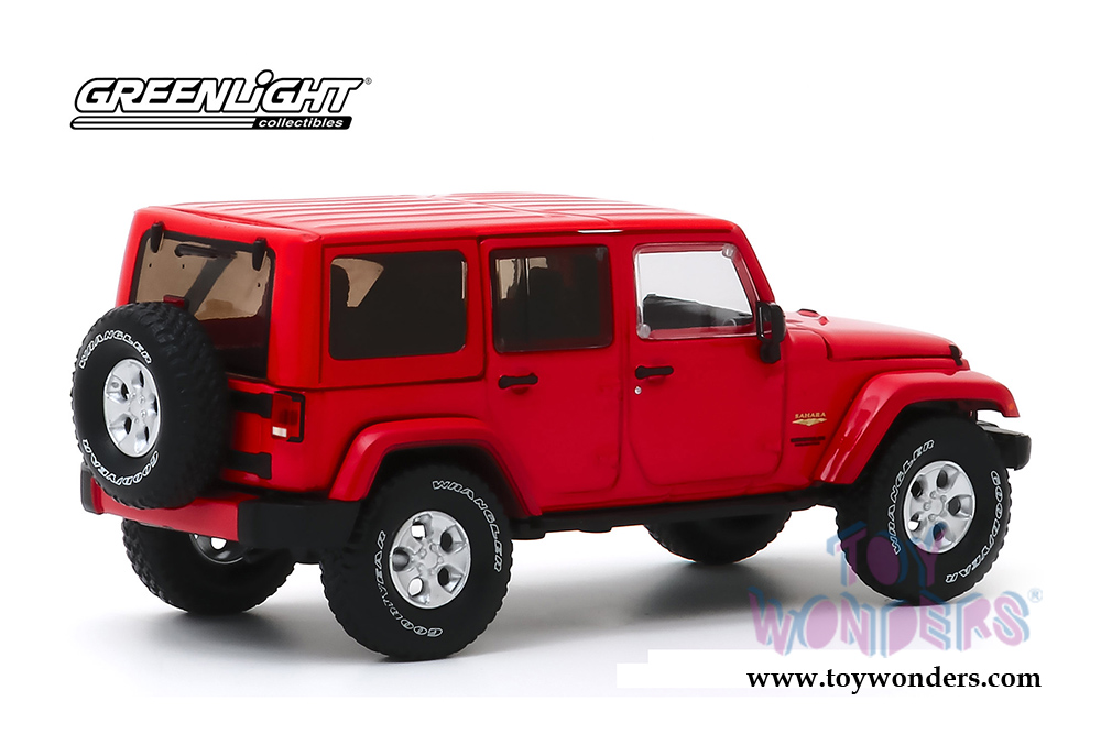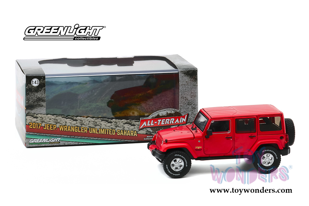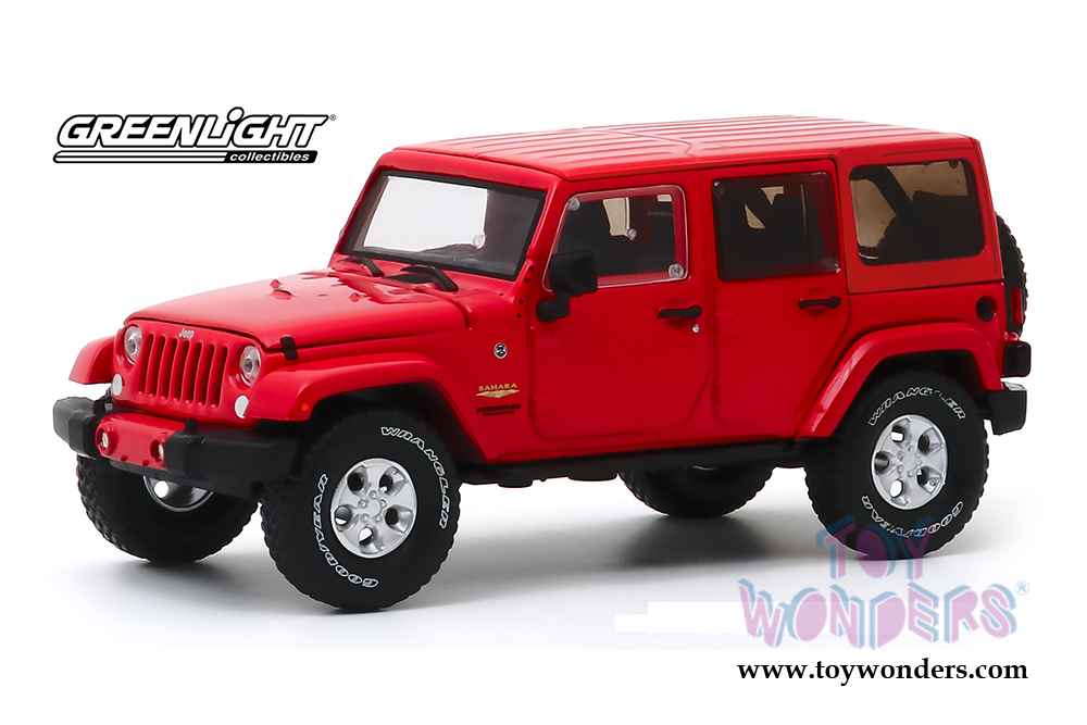 86177 Greenlight - All Terrain Jeep® Wrangler Unlimited Sahara. 1:43 scale diecast collectible model car. This 2013 Jeep is a 4.25" long diecast collection car. It sits on a display plaque. This Jeep® is manufactured by Greenlight. Item 86177 is in Firecracker Red. Individually packed in a hard-plastic case. Case size: 6.25"Lx 3.25"Wx 2.75"H.