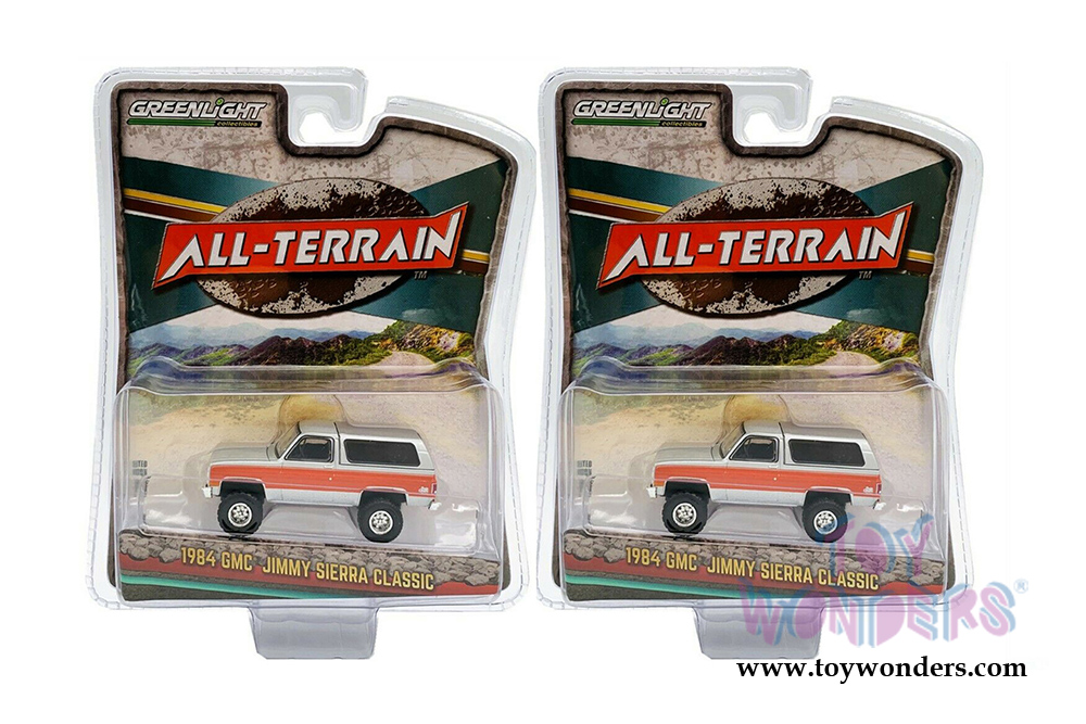 35170D/48 Greenlight - All Terrain Series 10 | 1984 GMC® Jimmy Sierra Classic (Lifted), 6 pcs set. 1:64 scale diecast collectible models. These cars are about 3.25" long diecast metal car. Each car Individually blister carded. Card size: 7.75" x 6.25". 6 pcs/inner. Manufactured by Greenlight. 35170D/48 is in Silver with red stripes.