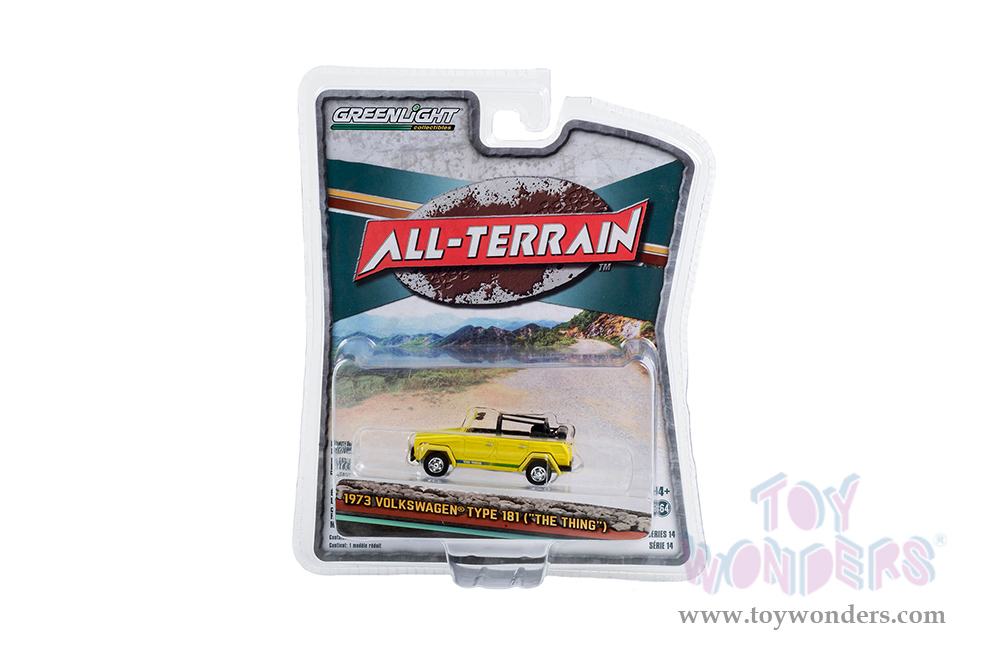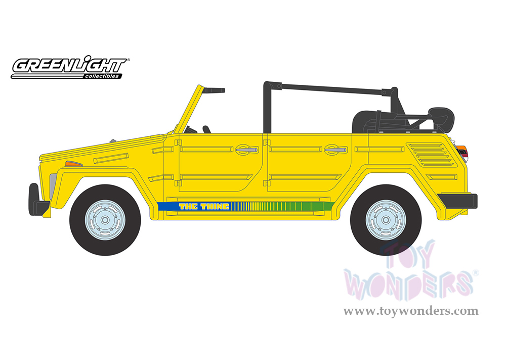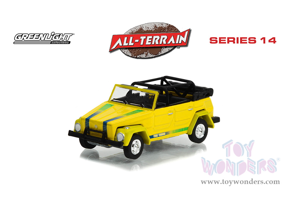 Greenlight - All Terrain Series 14 | Volkswagen® Thing (Type 181) "The Thing” (1973, 1/64 scale diecast model car, Yellow with Blue and Green Strobe Stripes) 35250A/48