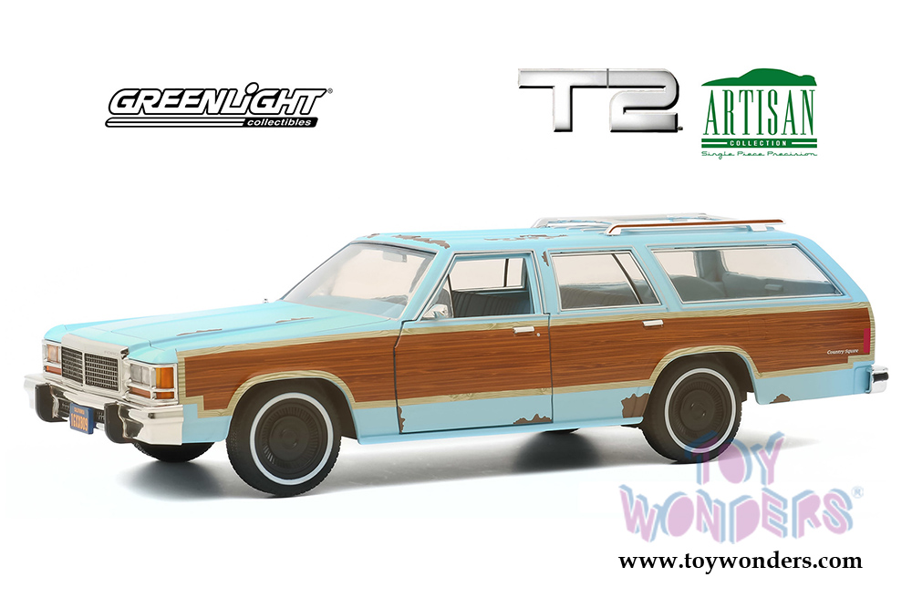 Greenlight - Artisan Ford LTD Country Squire with Wood Grain Paneling (Weathered) "Terminator 2: Judgment Day" (1979, 1/18 scale diecast model car, Light Blue) 19085