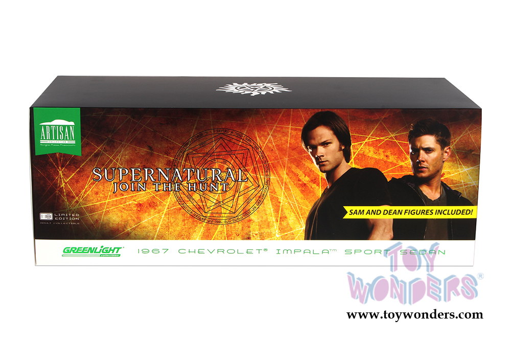 Greenlight - Artisan Supernatural (TV Series 2005) - Chevrolet Impala Sport Hardtop with Sam and Dean Figures (1967, 1/18 scale diecast model car, Black) 19021