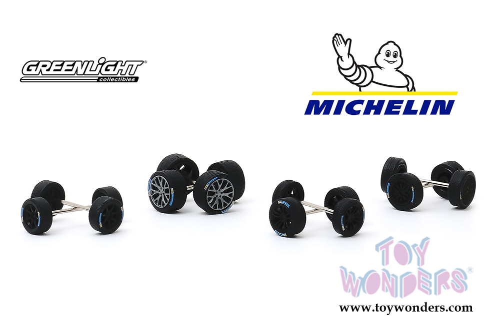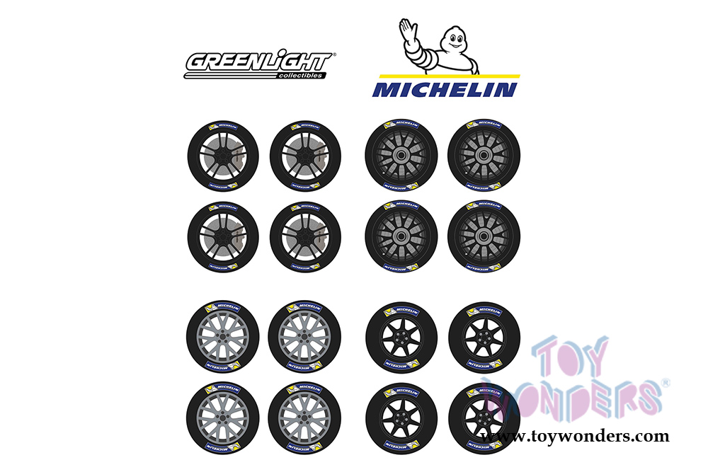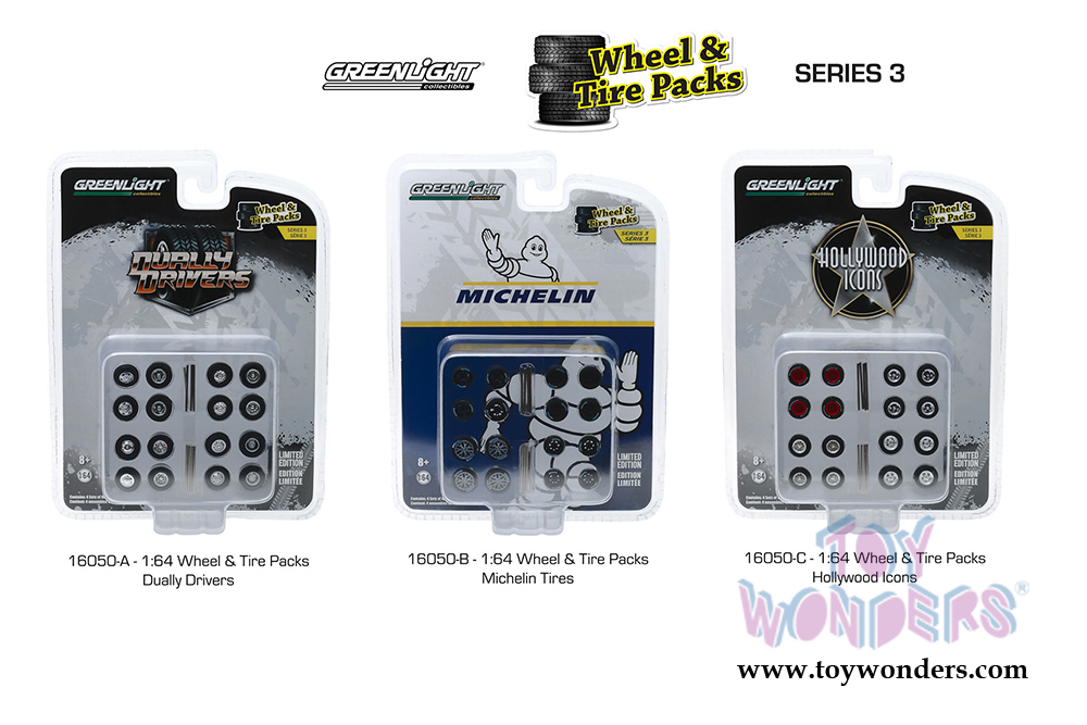 16050/48 Greenlight - Auto Body Shop - Wheel & Tire Packs Series 3. 1:64 scale rubber tires multi pack. This set includes 16 wheels, 16 tires and 8 axles. Diameter of each wheel approximately: 0.75 to 1" Individually packed in a window box. Packed in a blister card. Card size: 7.5" x 5.75". This accessory is manufactured by Greenlight. 6 sets per inner.