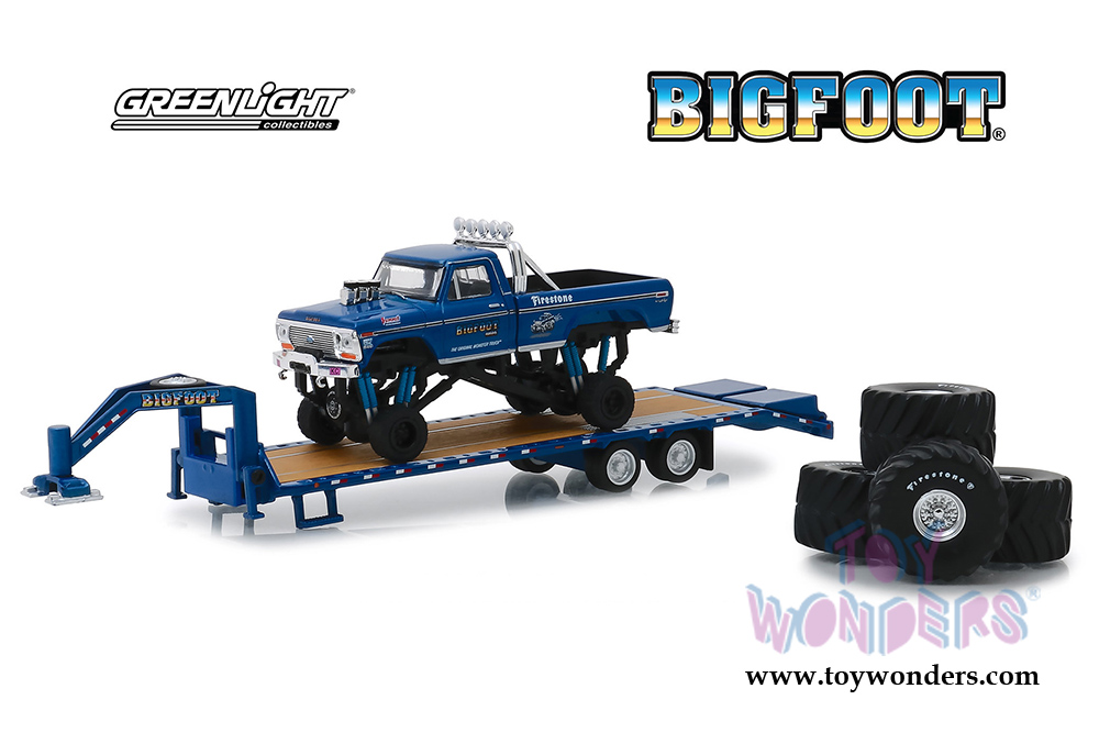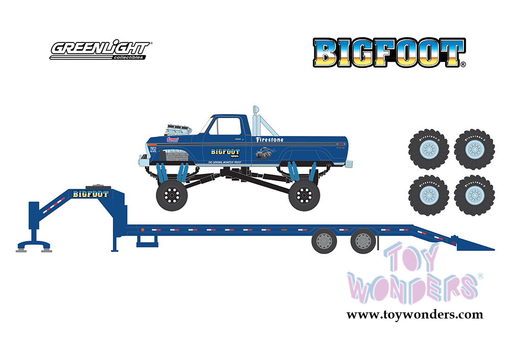 Greenlight - BIGFOOT® #1 The Original Monster Truck Ford F-250 Pickup with Gooseneck Trailer and 66" Tires replacement set (1974, 1/64 scale diecast model car, Blue) 30054/48