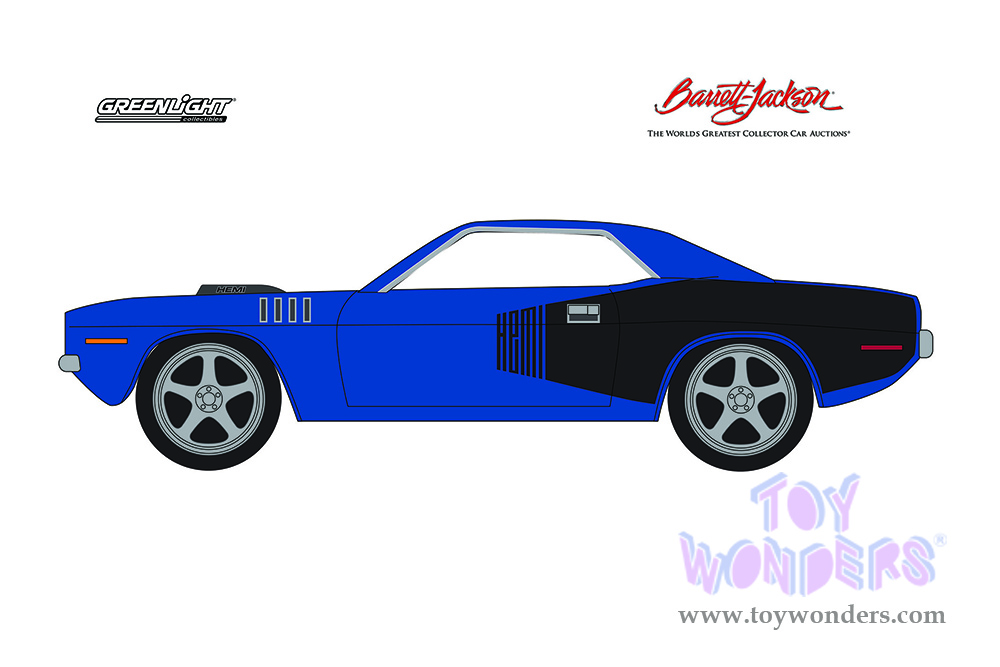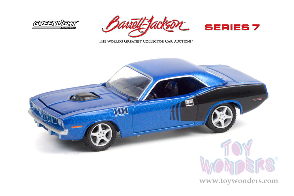 37230C/48 Greenlight - Barrett Jackson Scottsdale Series 7 | 1971 Plymouth Barracuda Custom Hardtop (Lot #720). 1:64 scale diecast collectible model. These cars are about 3" long diecast metal cars. Each car individually blister carded. Card size: 6" x 8". 6 pcs/inner. Manufactured by Greenlight. 37230C/48 is in Blue with Modern HEMI Lettering.