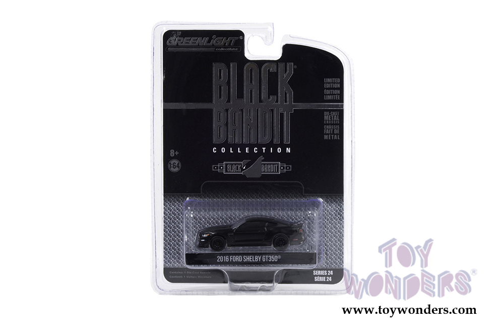 28050E/48 Greenlight Black Bandit - Series 24 | 2016 Ford Mustang Shelby GT350. 1:64 scale diecast collectible model car. This Ford Escort is a 3" long diecast car. Each car individually blister carded. 6 pcs/inner. Card size: 7.75" x 5.75". These cars are manufactured by Greenlight.