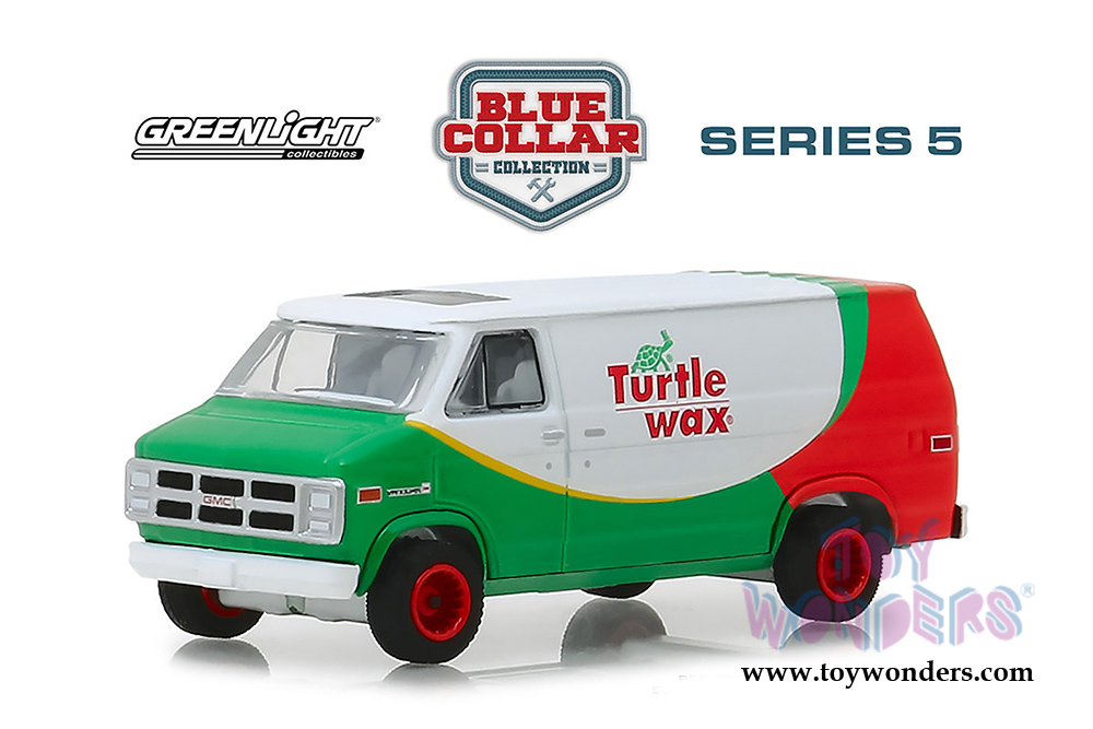 35120E/48 Greenlight - Blue Collar Collection Series 5 | 1983 GMC® Vandura - Turtle Wax (six-piece set). 1:64 scale diecast collectible model. This GMC® Van is a 3" long diecast metal car. Each car individually blister carded. Card size: 7.5" x 5.5". 6 pcs/inner. Manufactured by Greenlight. 35120E/48 is in GREEN color with red and white.