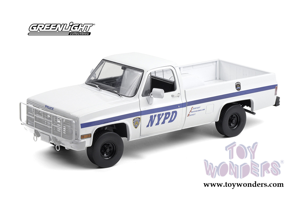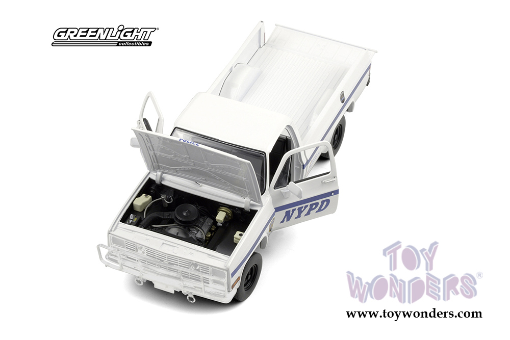 13561 Greenlight - 1984 Chevrolet® CUCV M1008 New York City Police Department NYPD. 1:18 scale diecast collectible model car. This Chevy® is approximately 11"L x 4"W x 3.5"H diecast metal car with some plastic parts. Detailed interior, exterior, engine compartment. Openable doors, tailgate and hood. This Police car is manufactured by Greenlight. 13561 is in White with blue stripes. Individually packed in a NYPD decorated window box. Box size: 14"L x 6.25"W x 5.5"H. 6 pcs per inner.