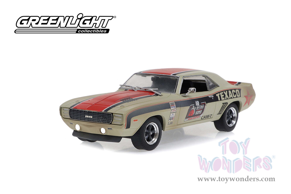 86353 Greenlight - 1969 Chevrolet® Camaro RS #18 - Texaco. 1:43 scale diecast collectible model. This Chevy® car is 4.5"L x 1.75"W x 1.5"H diecast model car. It does not have any openings. This Chevy® Camaro is manufactured by Greenlight. Limited Edition. 86353 is in cream and red. Individually packed in a hard-plastic case. Case size: 6.5"L x 3"W x 2.75"H.
