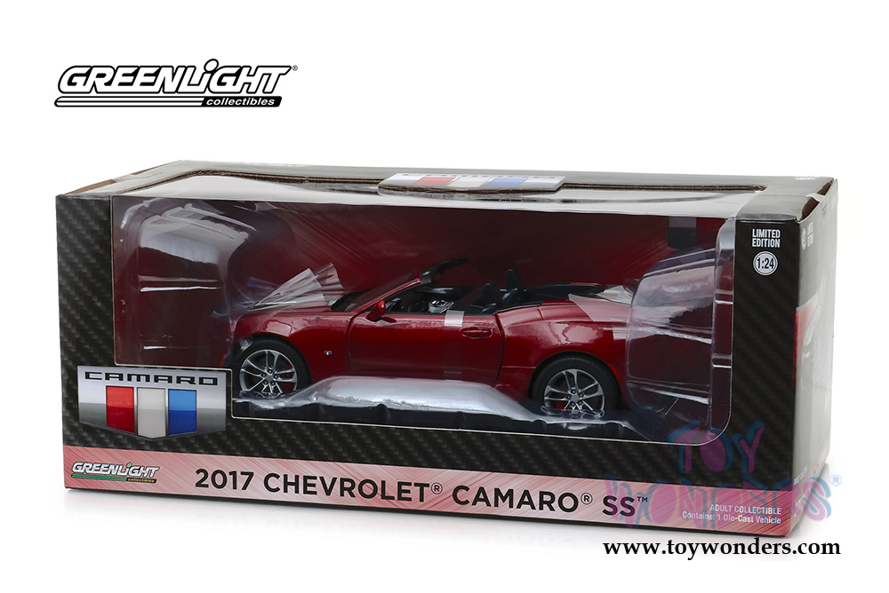 18245 Greenlight - 2017 Chevrolet® Camaro® SS™ Convertible. 1:24 scale diecast collectible model car. This Chevy® Camaro® is 7.25"L x 3"W x 2.5"H diecast collection car with openable doors and hood. New tooling, authentic decoration and true-to-scale detail. This 2017 Chevy® Camaro® is manufactured by Greenlight. Limited Edition. 18245 is in Garnet RED Tintcoat color. Individually packed in a window box. Box size: 10.75"L x 5.25"W x 4.25"H. 6 pcs per inner.