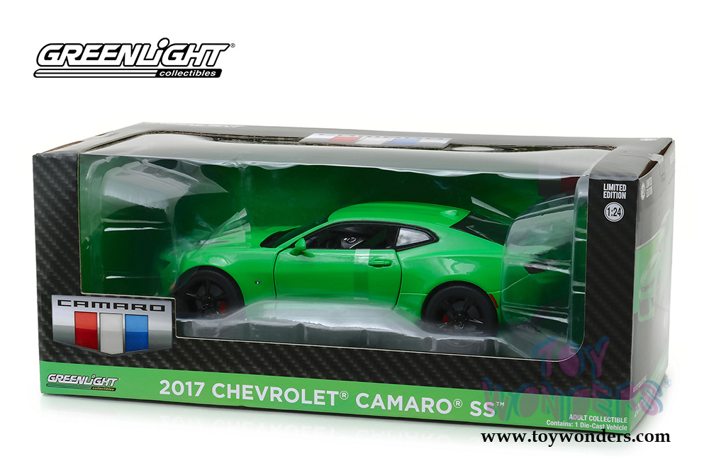 18244 Greenlight - 2017 Chevrolet® Camaro® SS™ Hard Top. 1:24 scale diecast collectible model car. This Chevy® Camaro® is 7.25"L x 3"W x 2.5"H diecast collection car with openable doors and hood. New tooling, authentic decoration and true-to-scale detail. This 2017 Chevy® Camaro® is manufactured by Greenlight. Limited Edition. 18244 is in Krypton GREEN color. Individually packed in a window box. Box size: 10.75"L x 5.25"W x 4.25"H. 6 pcs per inner.
