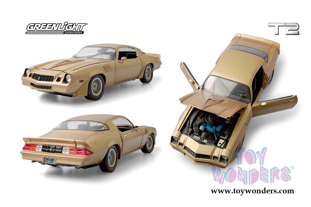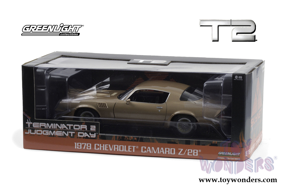 13573 Greenlight - 1979 Chevrolet® Camaro Z/28® Hardtop - Terminator 2: Judgement Day (1991 Movie). 1:18 scale, This Chevy® is a 10.25"L x 4"W x 2.75"H diecast collectible car.  Limited Edition. 13573 is in Gold. Manufactured by Greenlight. Individually packaged in window box. 13.5"L x 6.5"W x 5.5"H.
