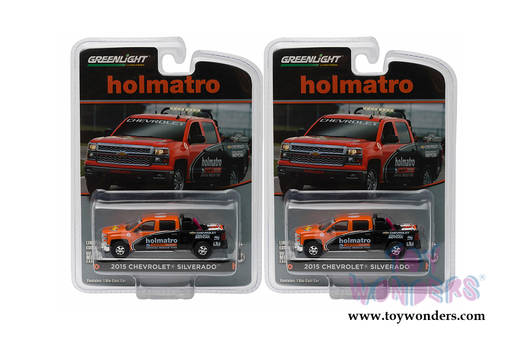 51033 Greenlight - 2015 Chevrolet® Silverado™ Pickup Truck Holmatro IndyCar Safety Team with Safety Equipment. 1:64 scale diecast collectible model. These cars are 3.5" long diecast metal cars. Each car individually blister carded. Card size: 5.75" x 7.5". 12 pcs/inner. Manufactured by Greenlight. 51033 is in orange with black.