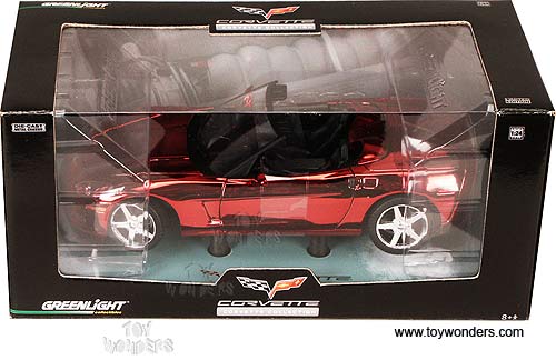 MMC02 Greenlight Corvette Collection- 2005 Chevrolet Corvette Convertible. 1:24 scale diecast collectible model car. This 2005 Chevy Corvette is a 7"Lx 3.25"Wx 2"H diecast collection car with openable doors & hood. This 05 Chevrolet Corvette is manufactured by Green Light. Corvette collection. MMC02 is in RED CHROME color. Individually packed in a window box WB. Box size: 9"Lx 4.25"Wx 4"H. GM is a trademark of the General Motors Corporation.