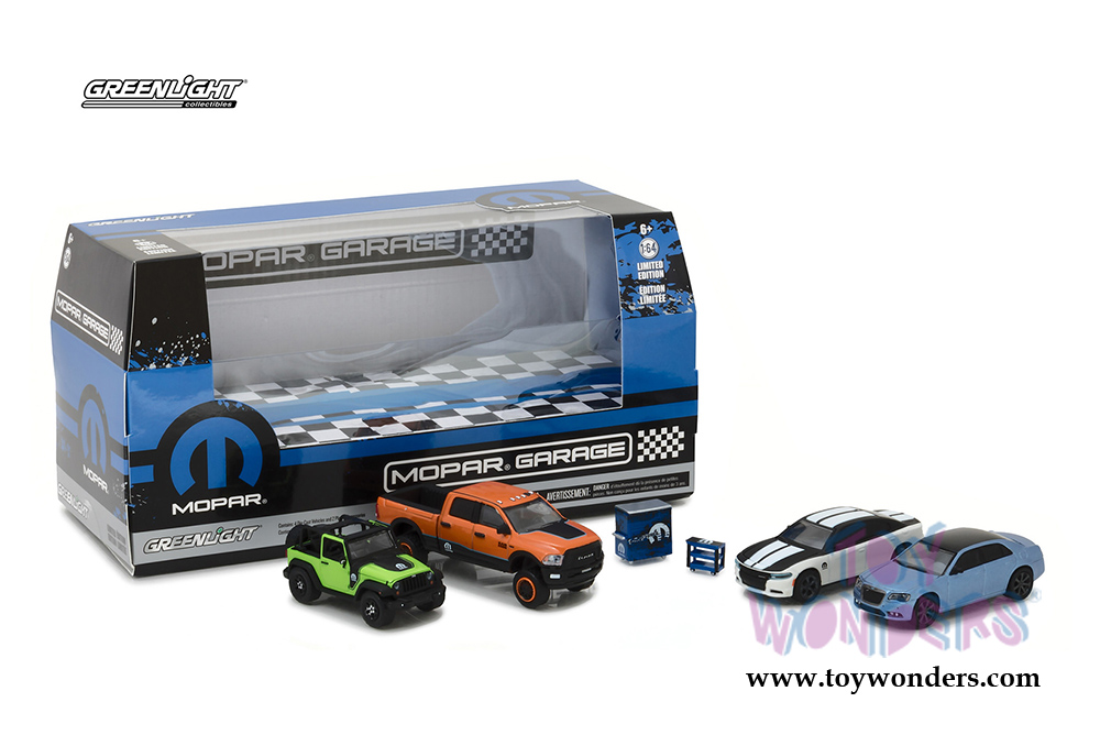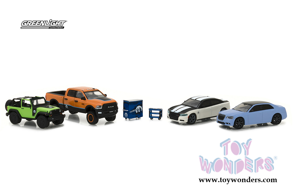 58041 Greenlight Dioramas - MOPAR Garage 6 pcs set. 1:64 scale diecast collectible model. Cars are about 2.5" long, truck is approximately 3" long die cast metal cars. 6 pcs Set is packed in a window box WB. Box size: 9.25"L x 4"W x 4.5"H. 6 pcs per inner. 58041 is in assorted colors and styles.
