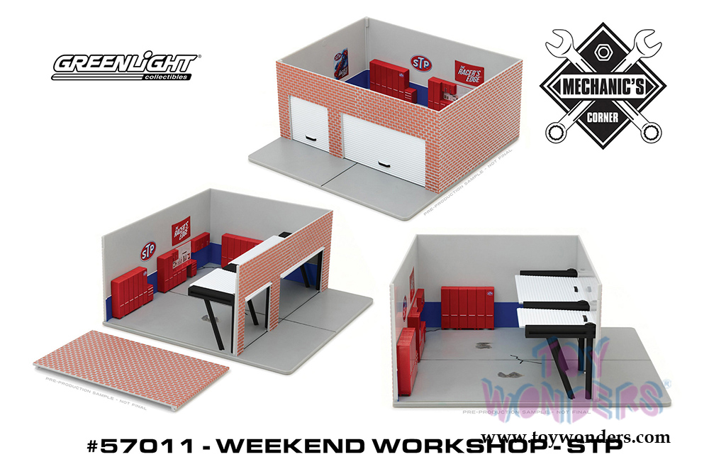 57011 Greenlight Dioramas - Mechanic's Corner Series 1 | Weekend Workshop STP. 1:64 scale diecast collectible model with plastic parts. Workshop model is 7"L x 7"W x 3"H. It comes packed in a window box WB. Box size: 8.75"L x 9"W x 4.5"H. 57011 is in STP colors, RED and Light Gray.