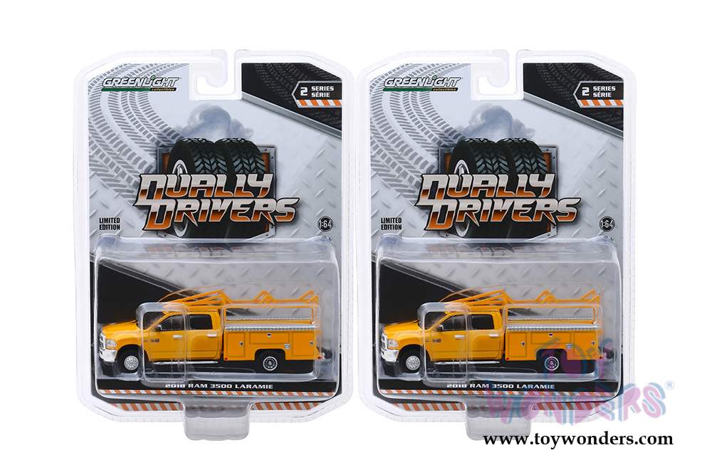 Greenlight - Dually Drivers Series 2 | Dodge Ram 3500 Dually Service Bed Truck with Ladder Rack (2018, 1/64 scale diecast model car, Orange) 46020C/48