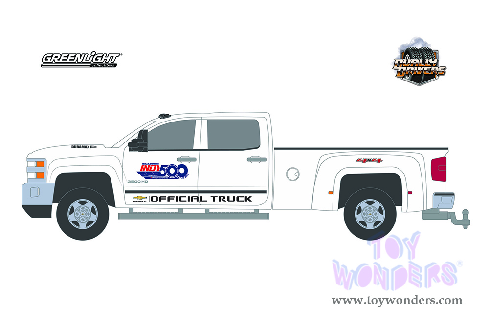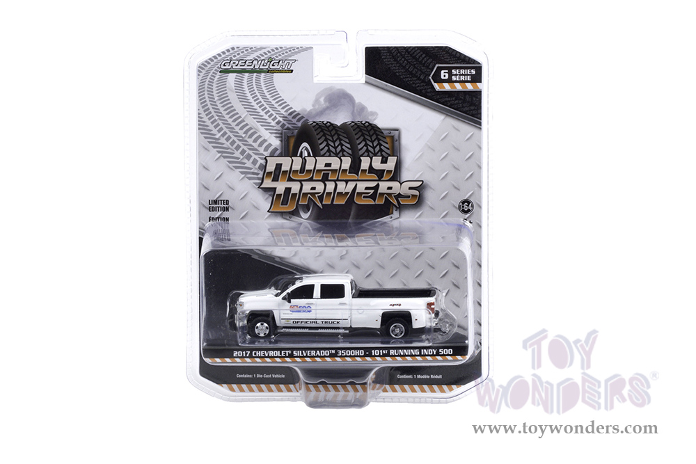 46060A/48 Greenlight - Dually Drivers Series 6 | 2017 Chevrolet® Silverado™ 3500 Dually 101 Running Indy 500 Pickup Truck - PennGrade Motor Oil, 6 pcs set. 1:64 scale diecast collectible models. These cars are about 4" long diecast metal car. Each car Individually blister carded. Card size: 7.75" x 6.25". 6 pcs/inner. Manufactured by Greenlight. 46060A/48 is in White.