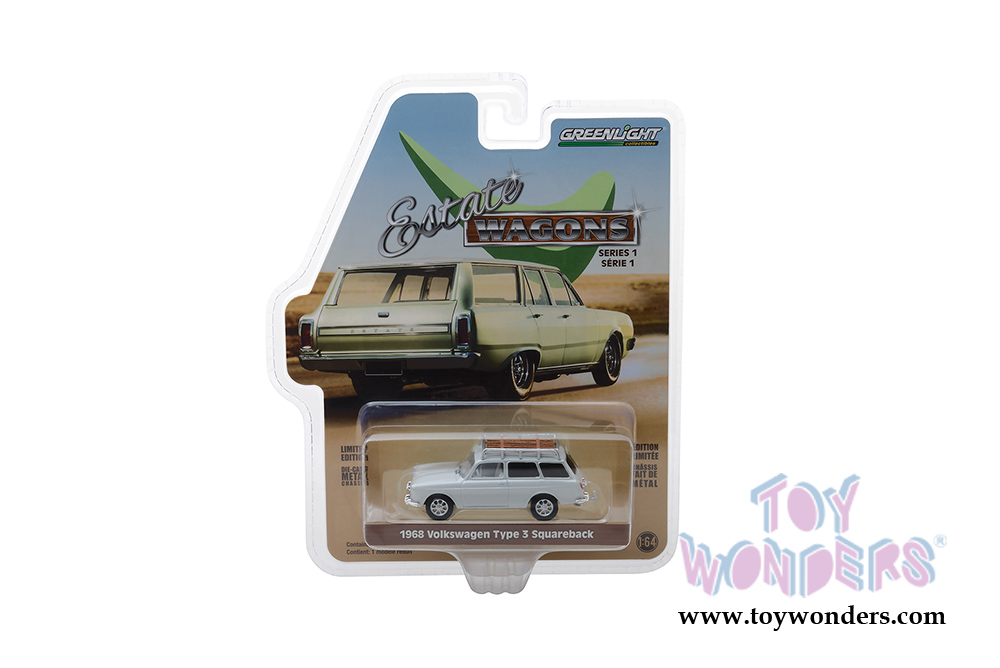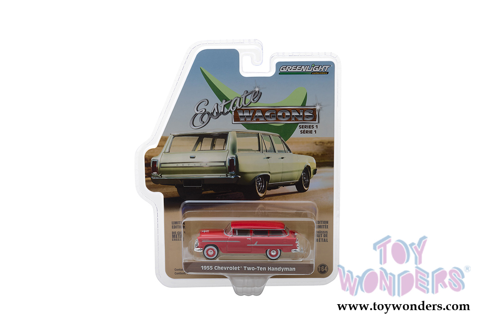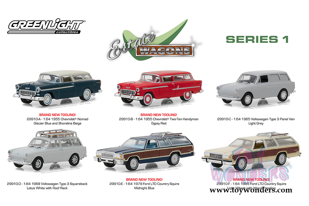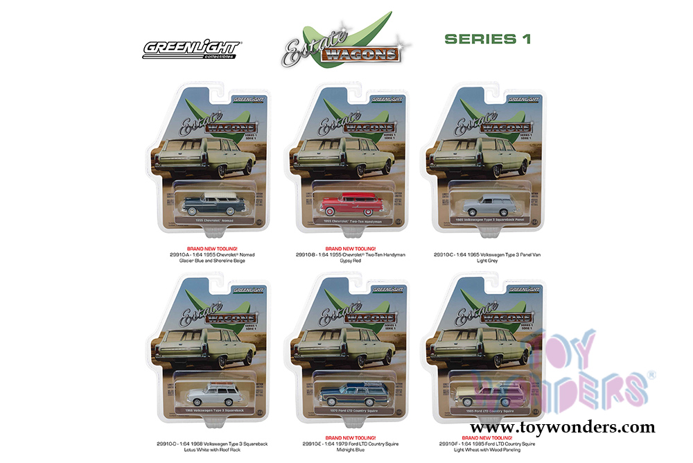 29910/48 Greenlight - Estate Wagons Series 1 (6 pcs. set). 1:64 scale diecast collectible model car. These wagons are between 2.5" and 3.25" long. 6 pc set. Limited Edition. Each car individually blister carded. Card size: 7.5" x 6". These cars are manufactured by Greenlight. Item 29910/48 comes in assorted colors and styles.
