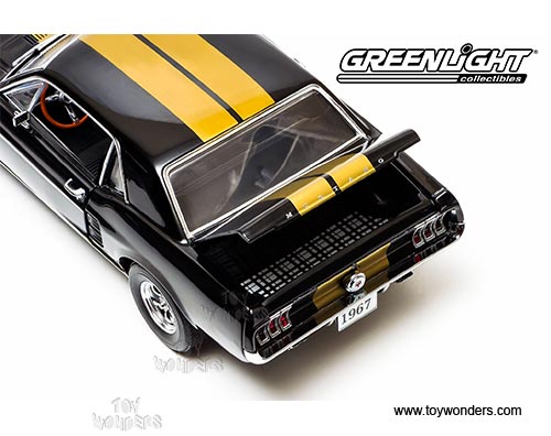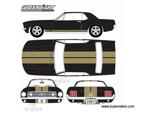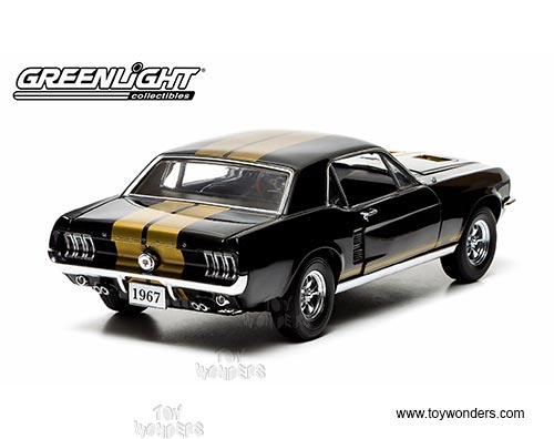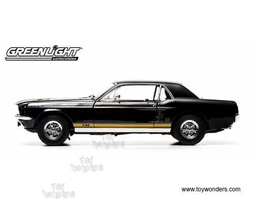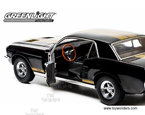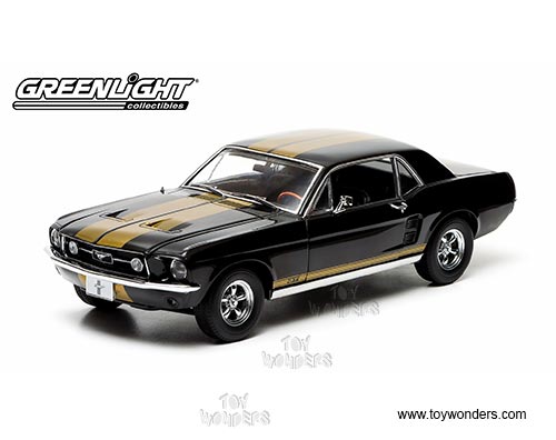 12897 Greenlight - 1967 Ford Mustang GT Hard Top. 1:18 scale diecast collectible model car. This Ford Mustang GT is a 9.75"L x 3.75"W x 2.75"H diecast collection car with opening doors, trunk & hood. Limited edition. This 1967 Ford Mustang GT is manufactured by Greenlight. 12897 is in BLACK with Gold stripes. Individually packed in a window box. Box size: 13.25"L x 6.25"W x 5"H.