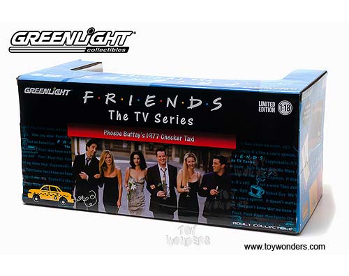 12887 Greenlight Friends TV Series - Phoebe Buffay's 1977 Checker Taxi. 1:18 scale diecast collectible model car. This 1977 Checker Taxi is an 11.25"H x 3.75"W x 4"H die cast metal car with openable hood, doors & trunk. 12887 is in YELLOW color. This 1977 Checker Taxi is manufactured by Greenlight. Individually packed in a window box. Box size: 13.75"Lx 6.25"Wx 5"H. Limited edition.