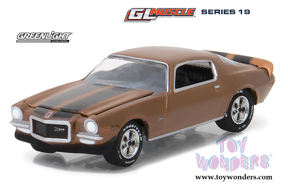 13190D/48 Greenlight - GL Muscle Series 19 | 1972 Chevrolet® Camaro Z/28 Hardtop (six-piece set). 1:64 scale diecast collectible model. This Chevy Camaro is a 3" long diecast metal car. Each car individually blister carded. Card size: 7.75" x 5.75". 6 pcs/inner. Manufactured by Greenlight. 13190D/48 is in Mojave Gold color.