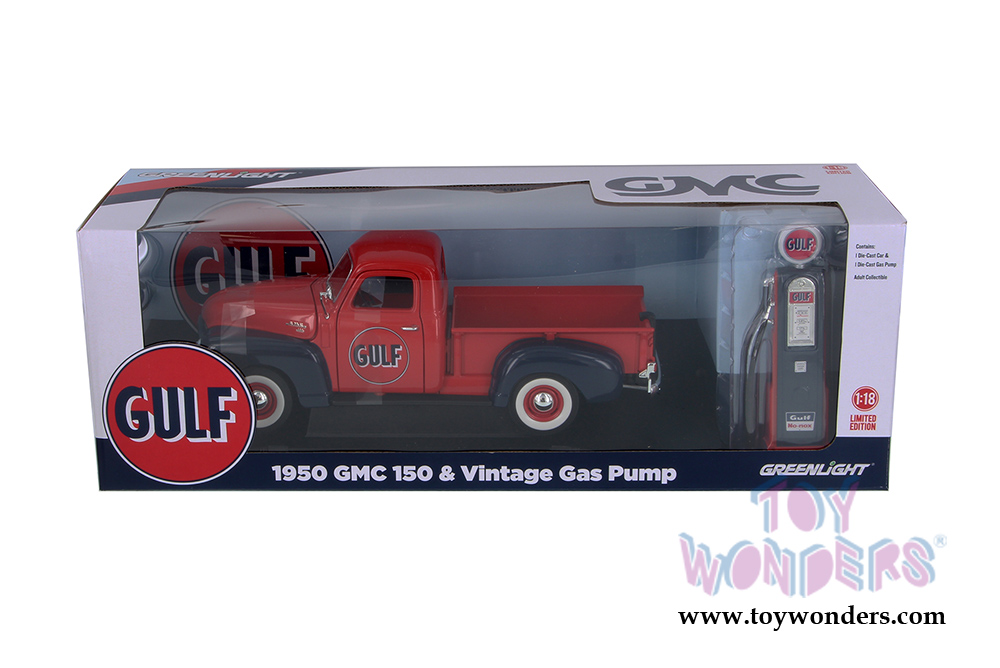 12984 Greenlight - 1950 GMC 150 Pickup Truck Gulf Oil with Vintage Gas Pump. 1:18 scale diecast collectible model car. This GMC is a 10.5"L x 4"W x 4"H die-cast collection car with openable doors, hood and tailgate. Pump is approximately 5.25 inches high. Limited edition. This pick-up truck is manufactured by Greenlight. Item 12984 is in RED color with dark Blue. Individually packed in a window box. Box size: 17.5"L x 6"W x 6"H.