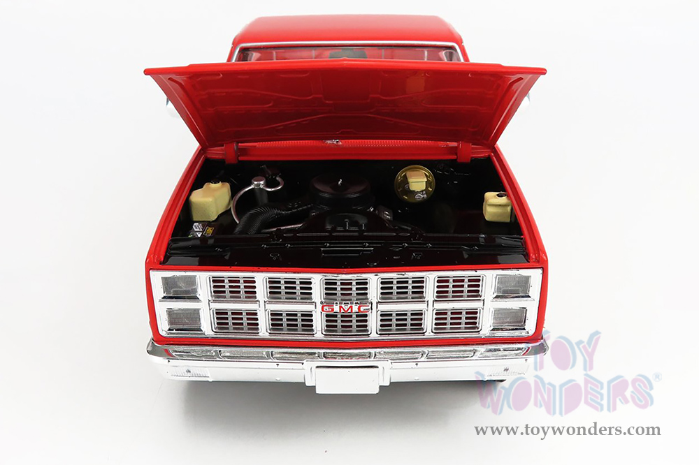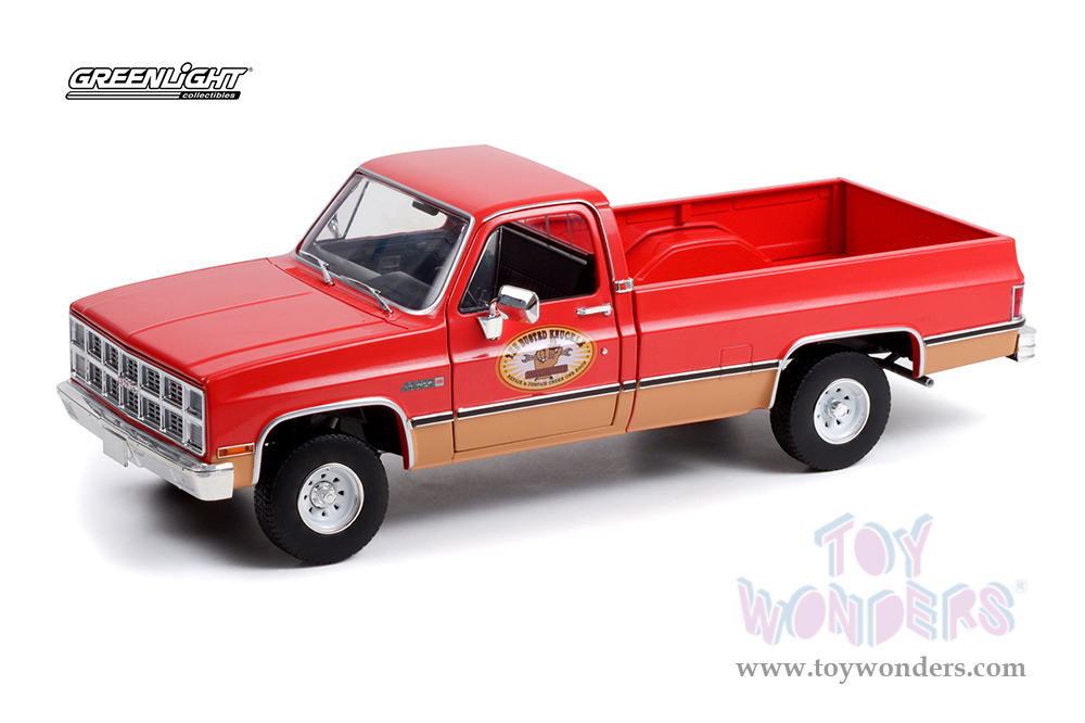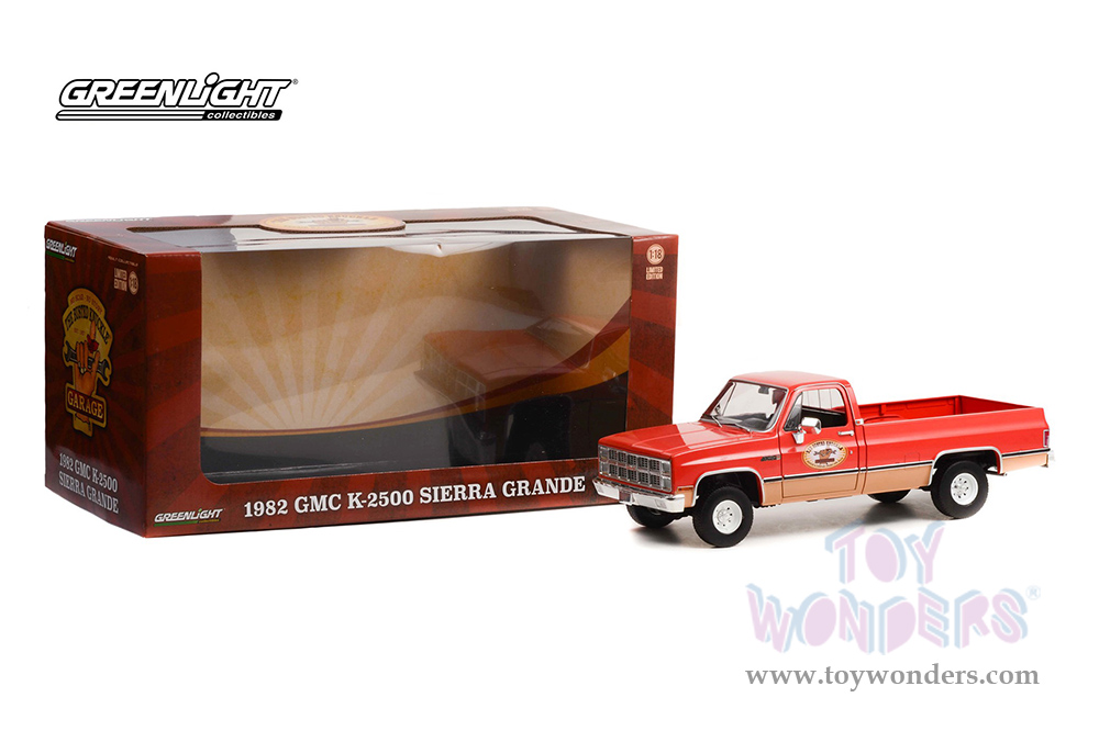 13612 Greenlight - 1982 GMC® K-2500 Sierra Grande Wideside with Trailer Hitch - Busted Knuckle Garage. 1:18 scale diecast collectible model car. This GMC® is a 12.25"L x 5.5"W x 5"H diecast metal car with some plastic parts. Detailed interior, exterior, engine compartment. Openable doors, tailgate, and hood. This Pickup Truck is manufactured by Greenlight. 13612 is in Red with beige. Individually packed in a window box. Box size: 14"L x 6.25"W x 5.5"H.