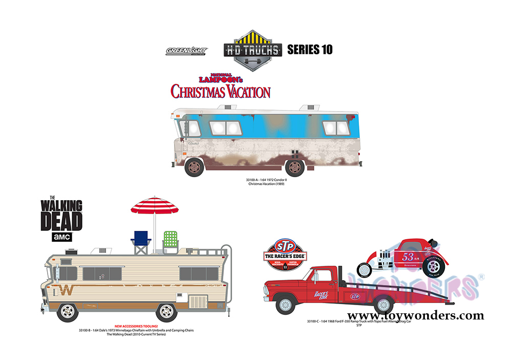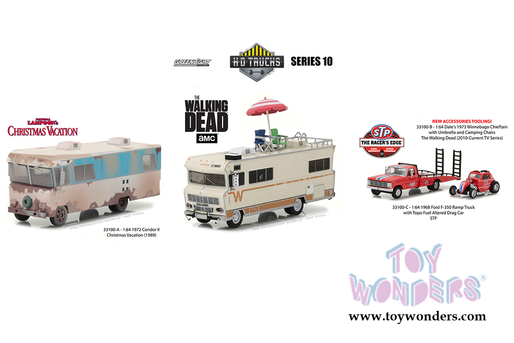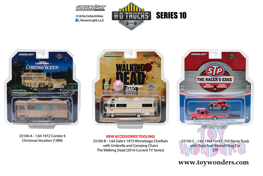 33100/48 Greenlight - Heavy Duty Trucks Series 10. 1:64 scale diecast collectible model car. Two 3-Piece sets (6 pc assortment). These HD Trucks are 5 1/2" long and topo car is 2" long. Limited edition. Each individually blister carded. Card size: 8.5"W x 8.5H". These trucks are manufactured by Greenlight.