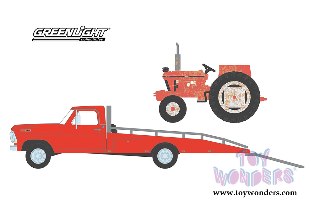 Greenlight - Heavy Duty Trucks Series 16 | 1969 F-350 Ramp Truck with Unrestored 1958 Ford 5610 Tractor (1958, 1969, 1/64 scale diecast model car, Red) 33160A/48