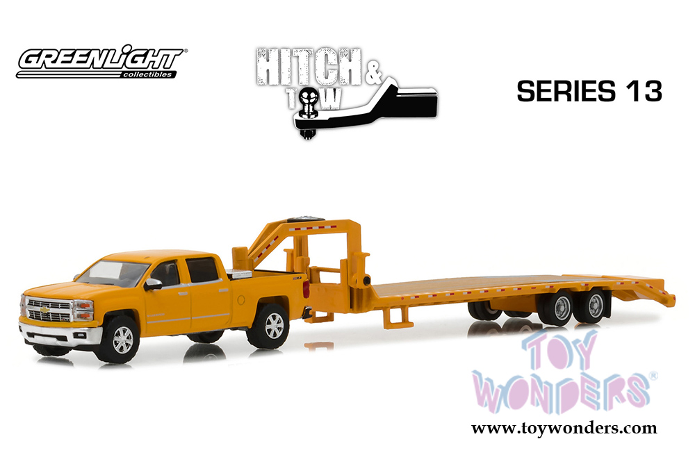 Greenlight - Hitch & Tow Series 13 | Chevrolet® Silverado™ and Gooseneck Trailer (2015, 1/64 scale diecast model car, Yellow) 32130B/24